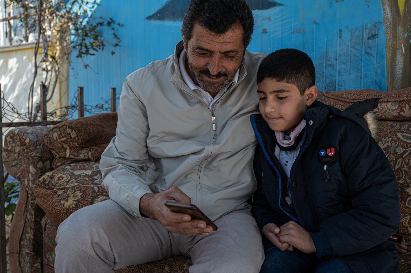 Osama sitter på en sofa ved siden av faren Mohammed (49) utenfor det enkle hjemmet deres i flyktningleiren Zaatari i Jordan. Her bor han sammen med moren, faren og syv søsken.