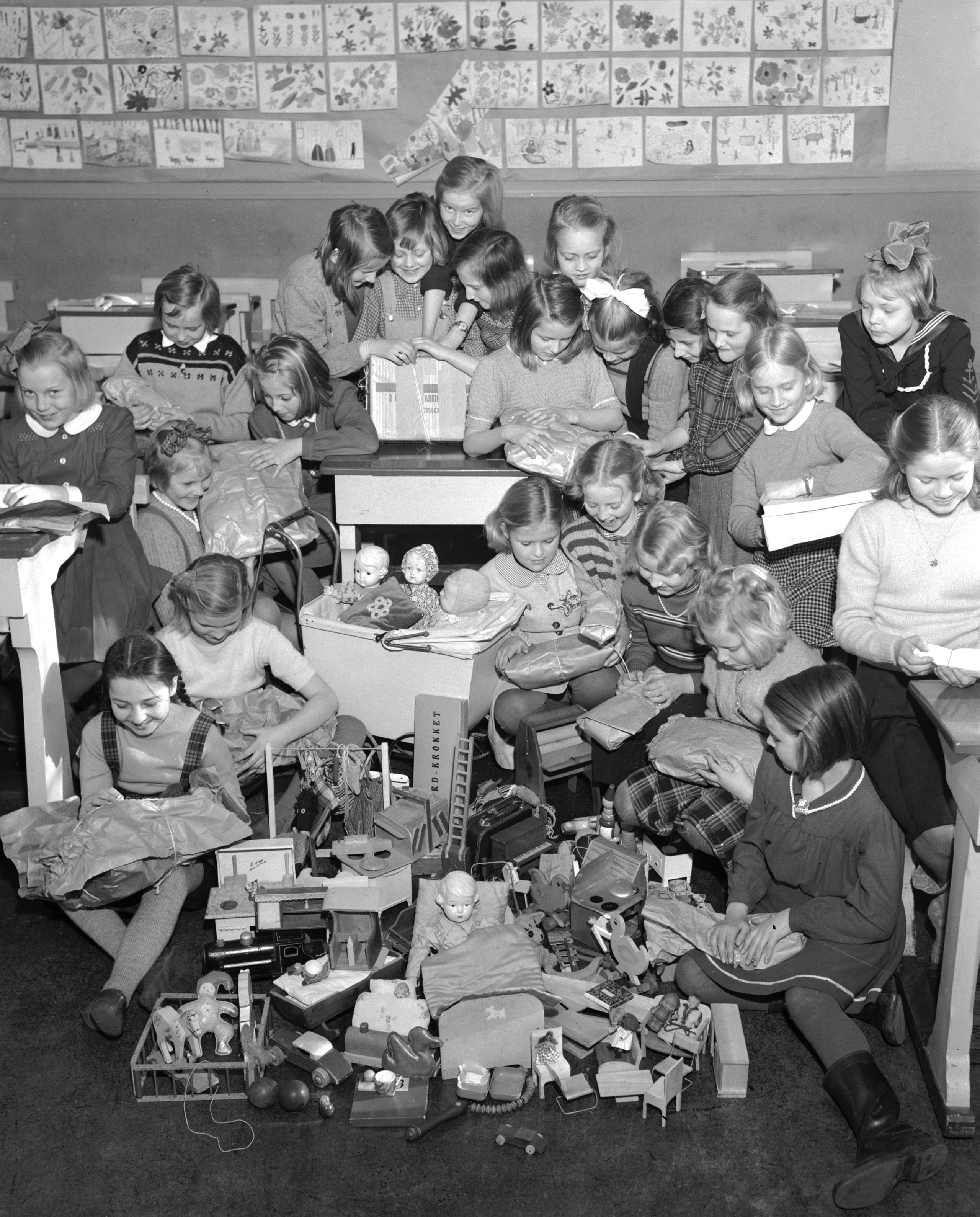 Norway continues to help. Here we see class 4C at Ullevål Primary School packing used toys for European children affected by the war.