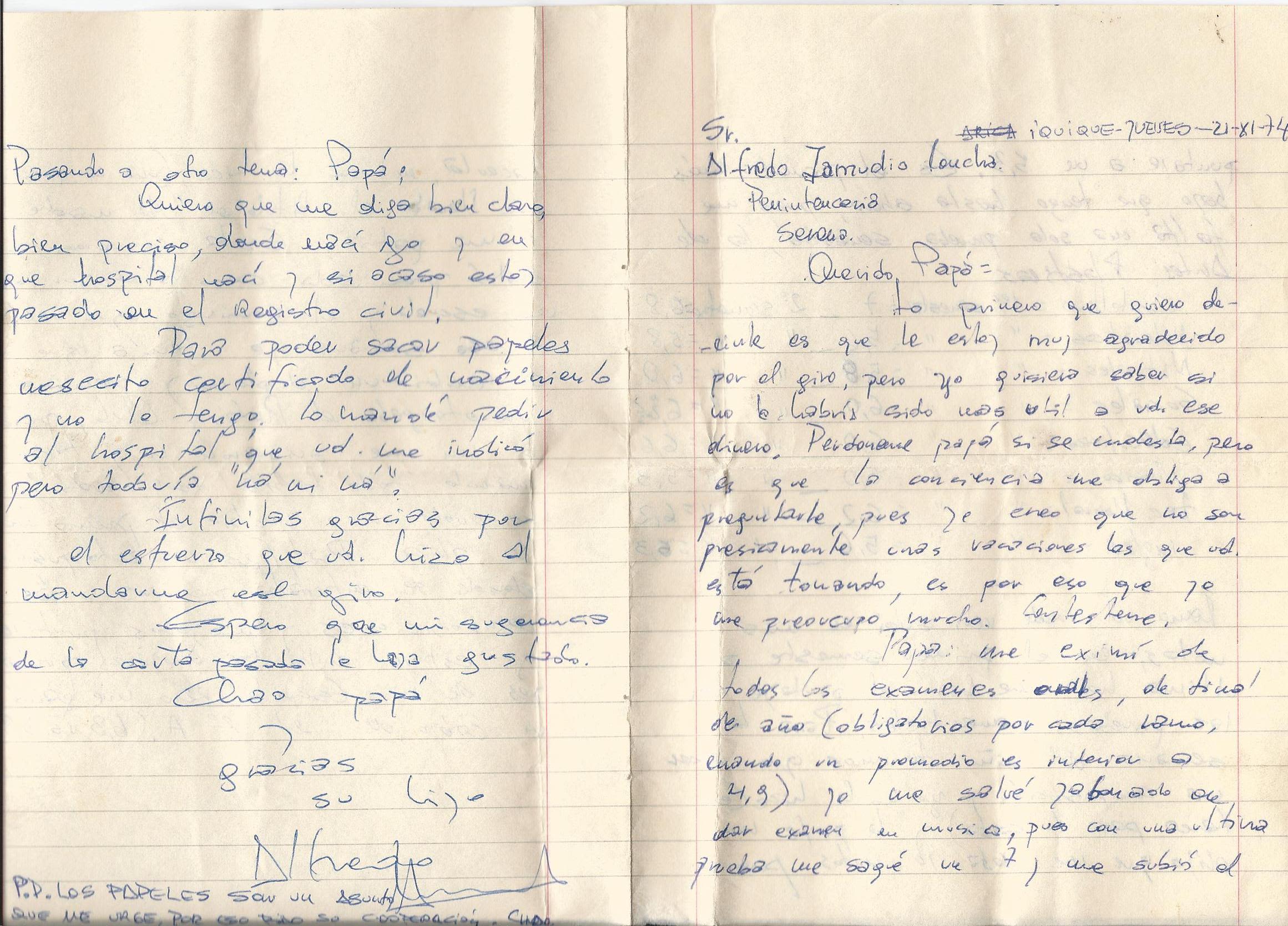 Faren satt i tre ulike fengsler, og Alfredo fulgte etter ham for å være nær ham: Først i Arica, så i byen La Serena og til sist i hovedstaden Santiago. Alfredo besøkte ham. Far og sønn skrev også brev til hverandre.