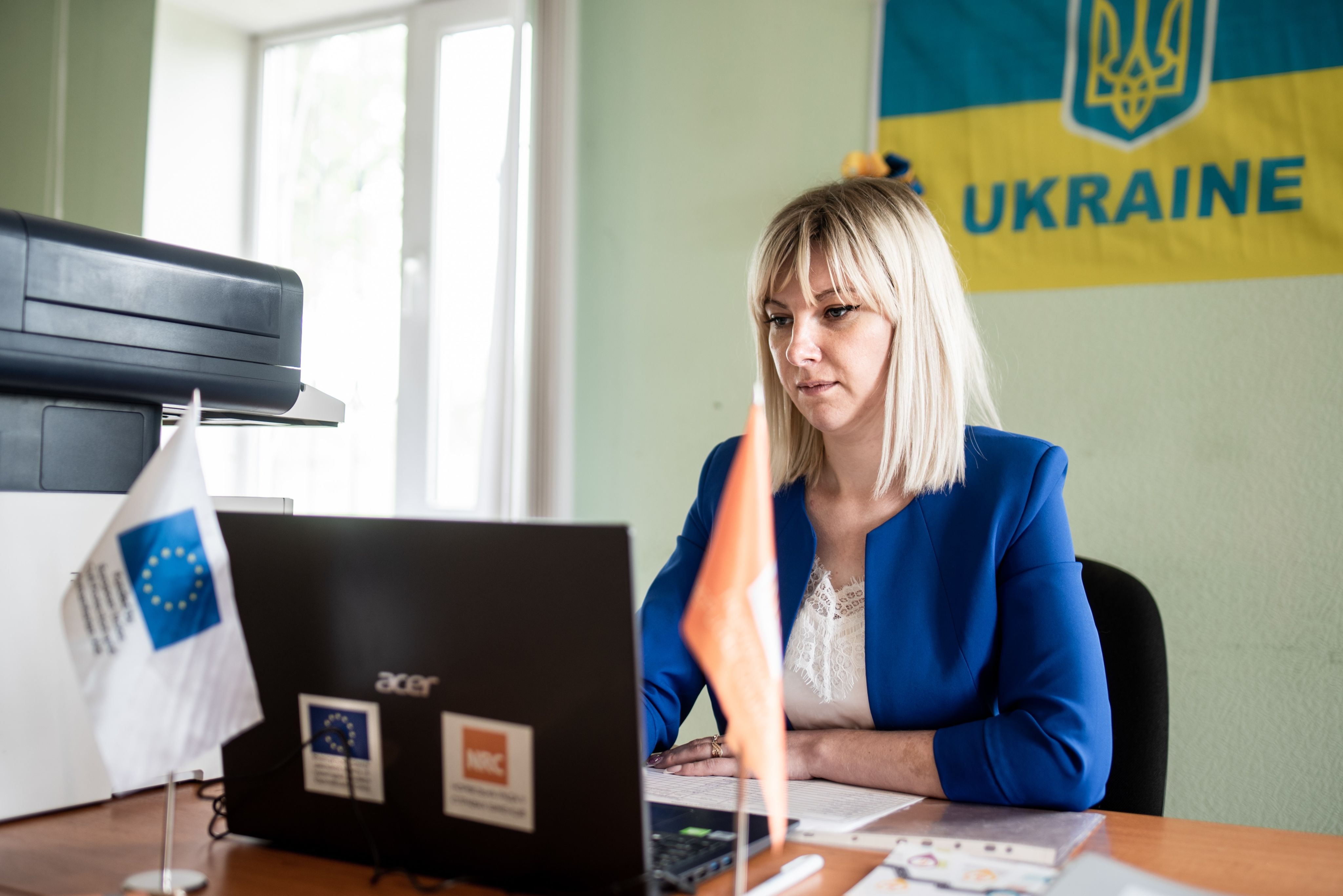 Svitlana Shavlinska is one of the volunteer paralegals. “I started providing paralegal services, including Covid-19 awareness-raising sessions, after completing an NRC training course on legal and protection issues. Some topics are very close to me, as a displaced person with similar pressing issues,” she says.