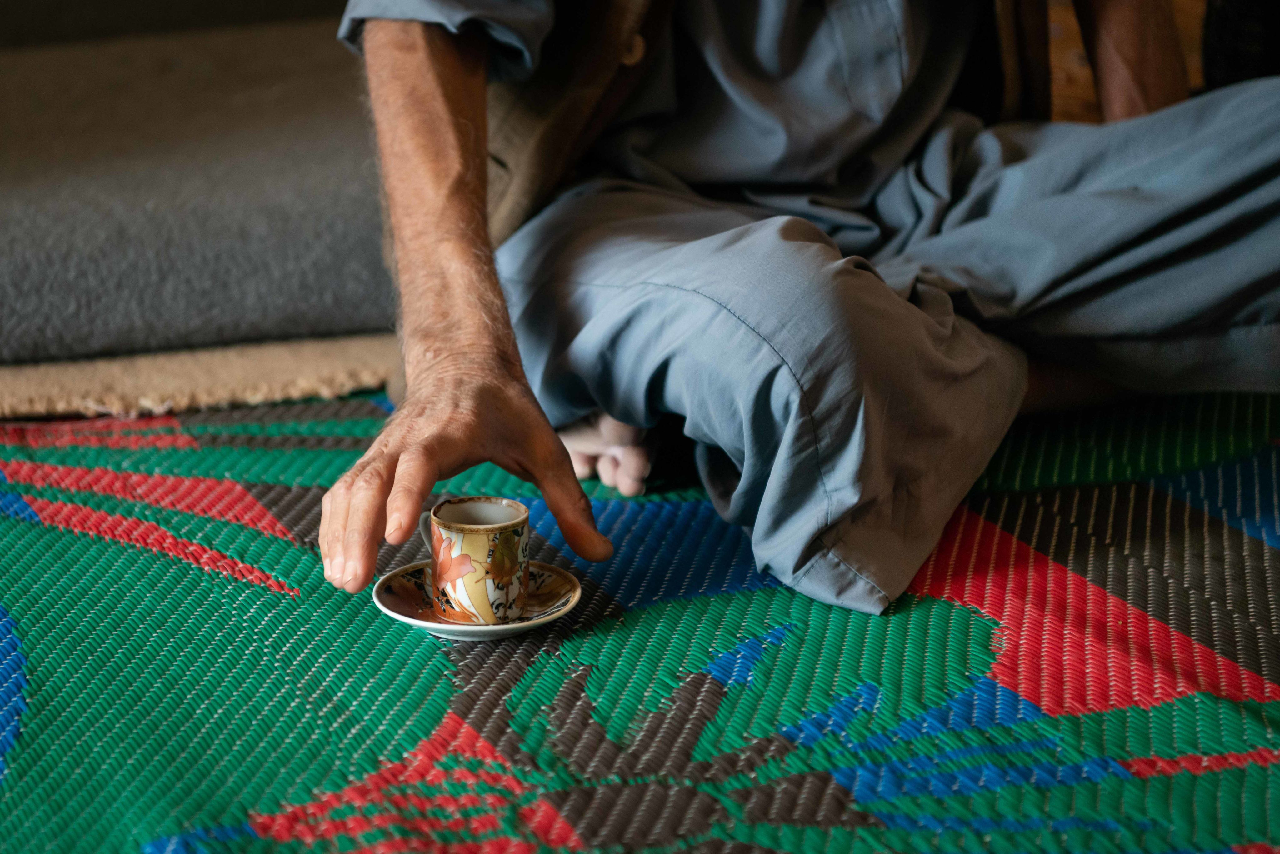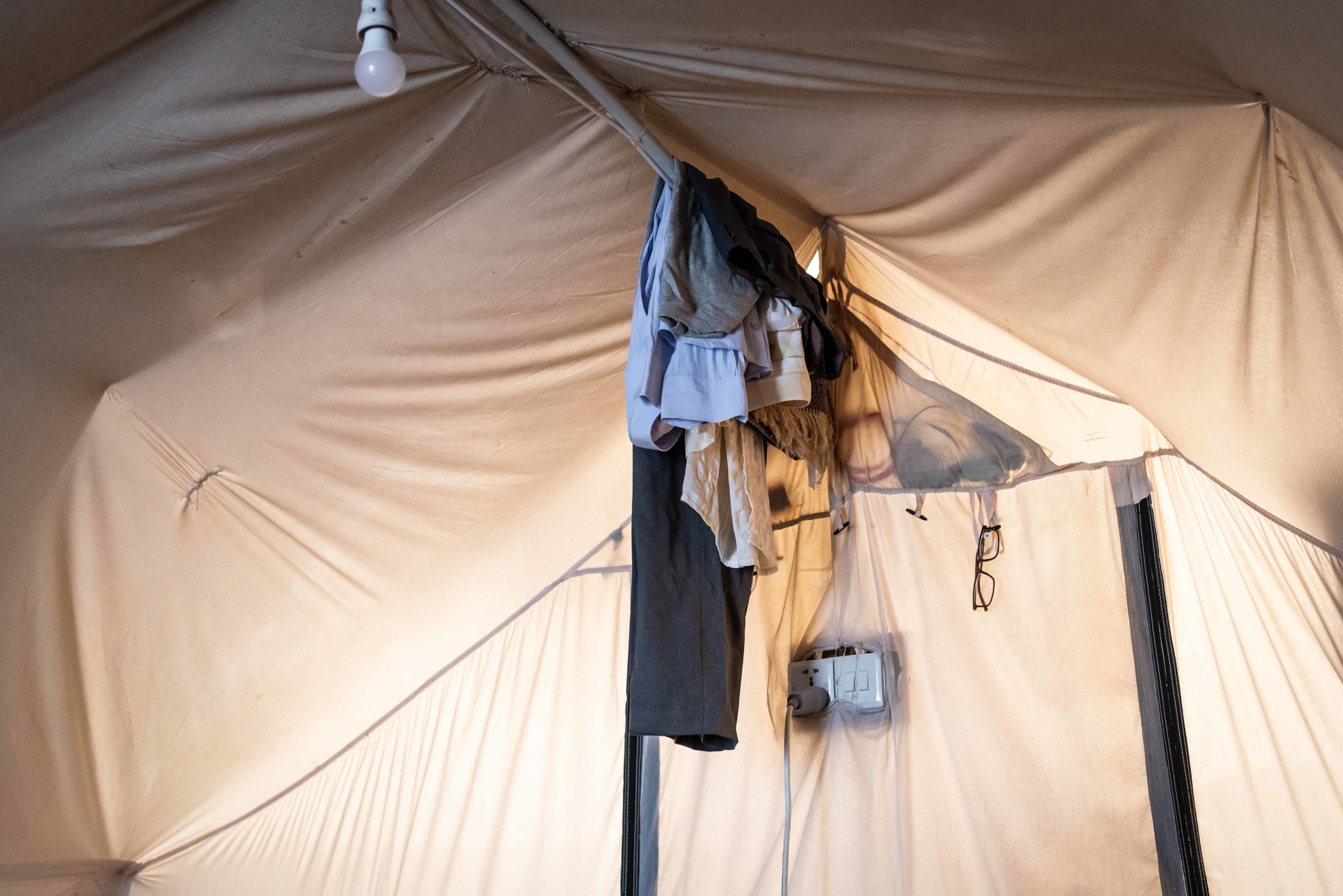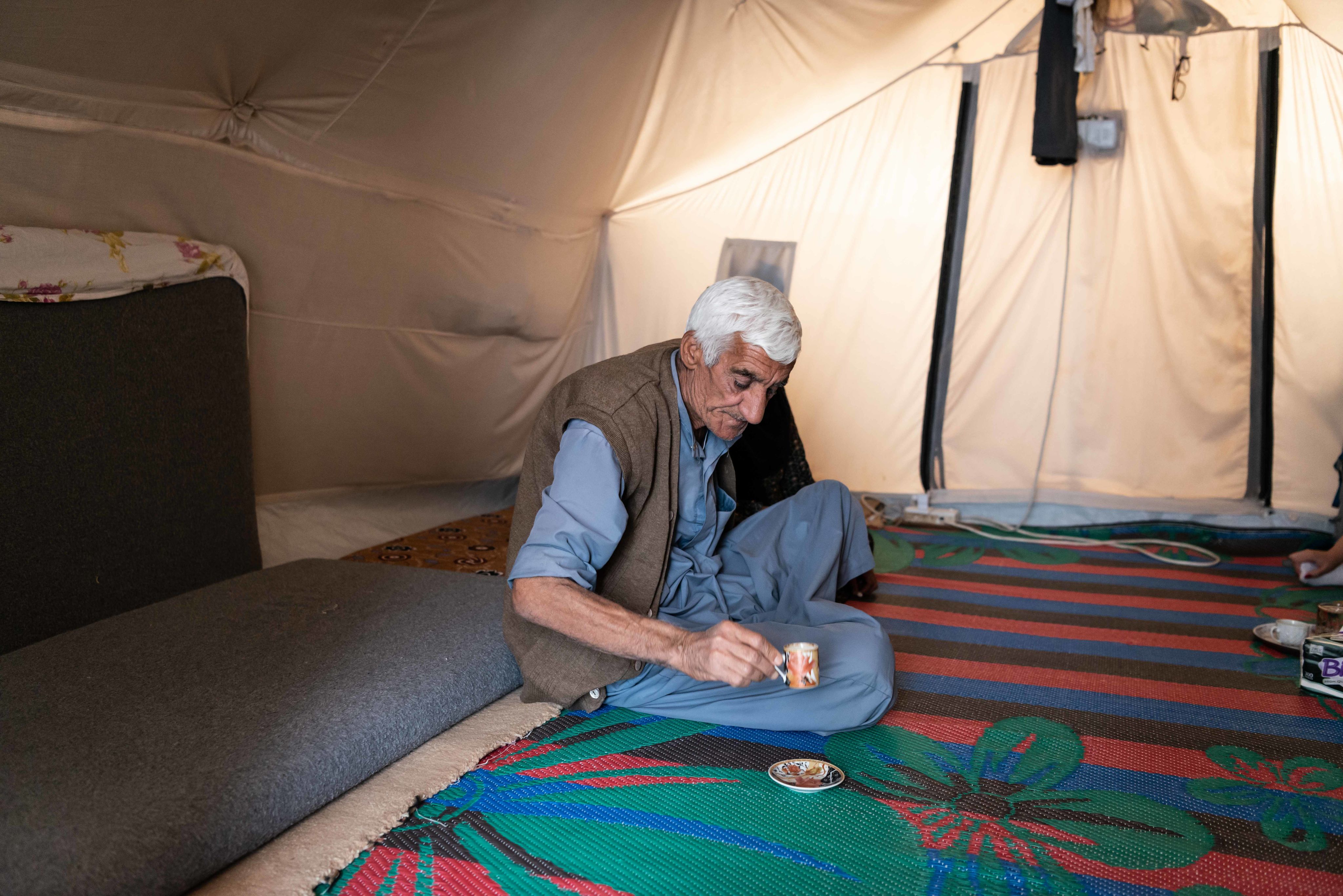 Mohamed (65) setter kaffekoppen ned på skålen, og lyden av et lite «klirr» henger igjen i luften. En slags sørgelig tonsetting til klærne som dingler fra en snor der oppe under teltduken. På gulvet ligger et par madrasser av skumgummi og et teppe.