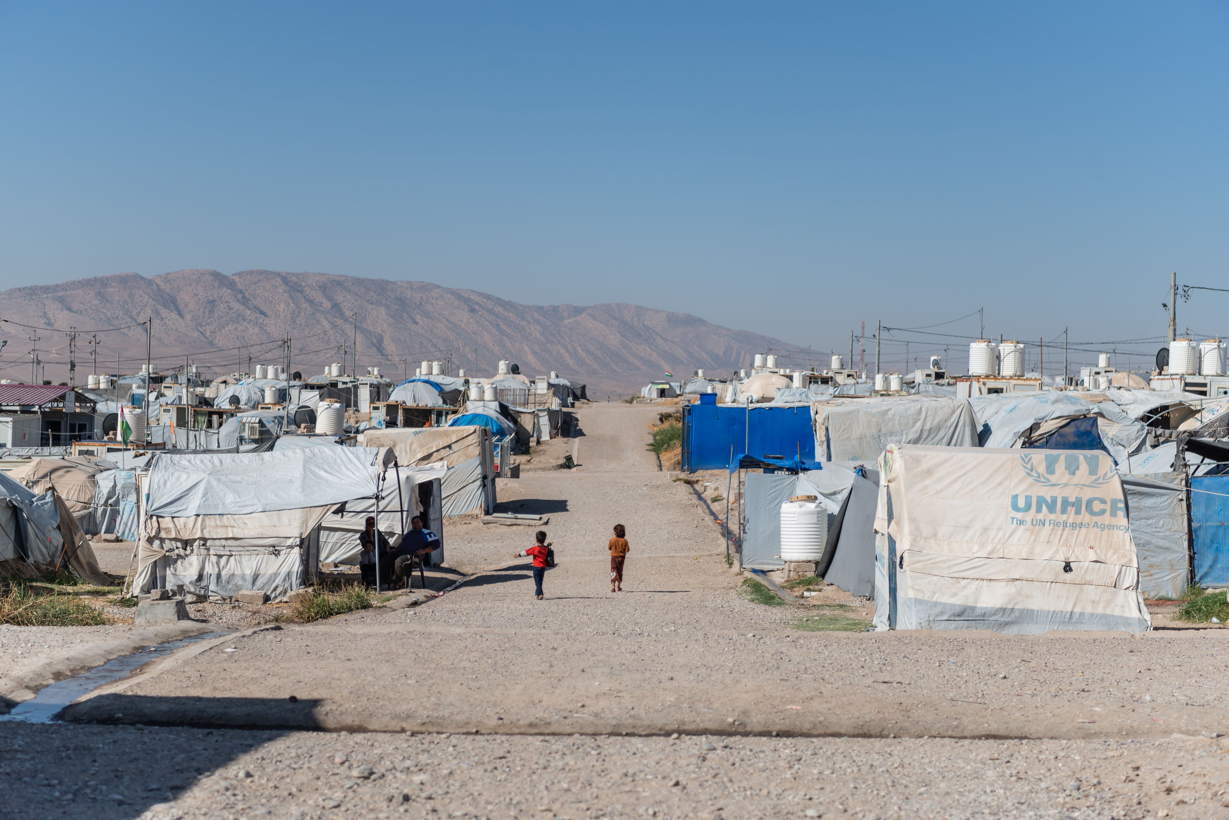 De hvite teltene står på rekke og rad i Bardarash flyktningleir. Utenfor leiren er landskapet steinete. I horisonten ligger de kurdiske fjellene.