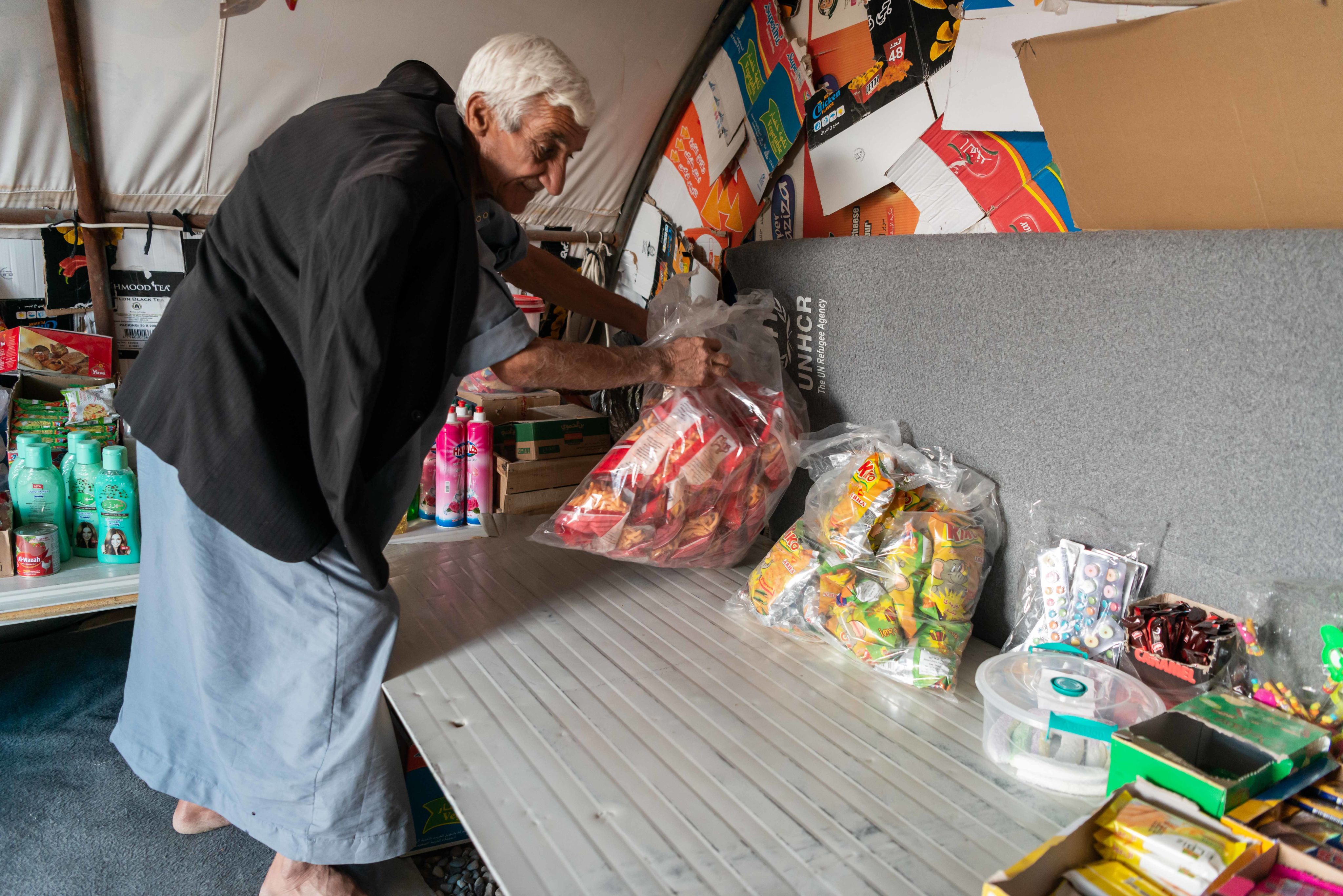 Butikken, som Flyktninghjelpen har støttet med midler, består av et lite telt, to kjøleskap, og noen bord med varer. Mohamed og sønnen Shamal selger brus, godteri, potetgull, hengelåser, og husholdningsvarer som såpe, vaskepulver, kjeks og hermetikk.